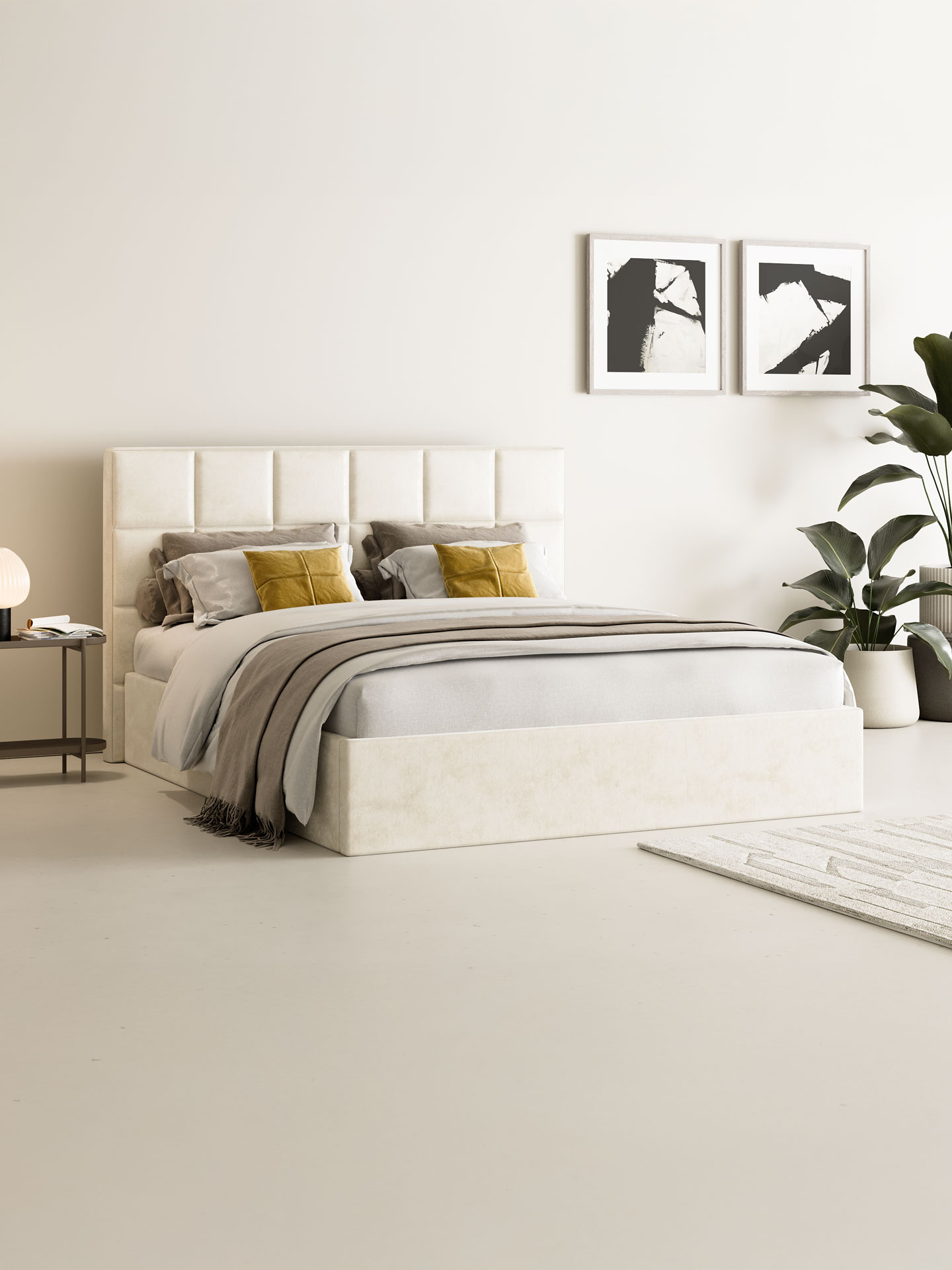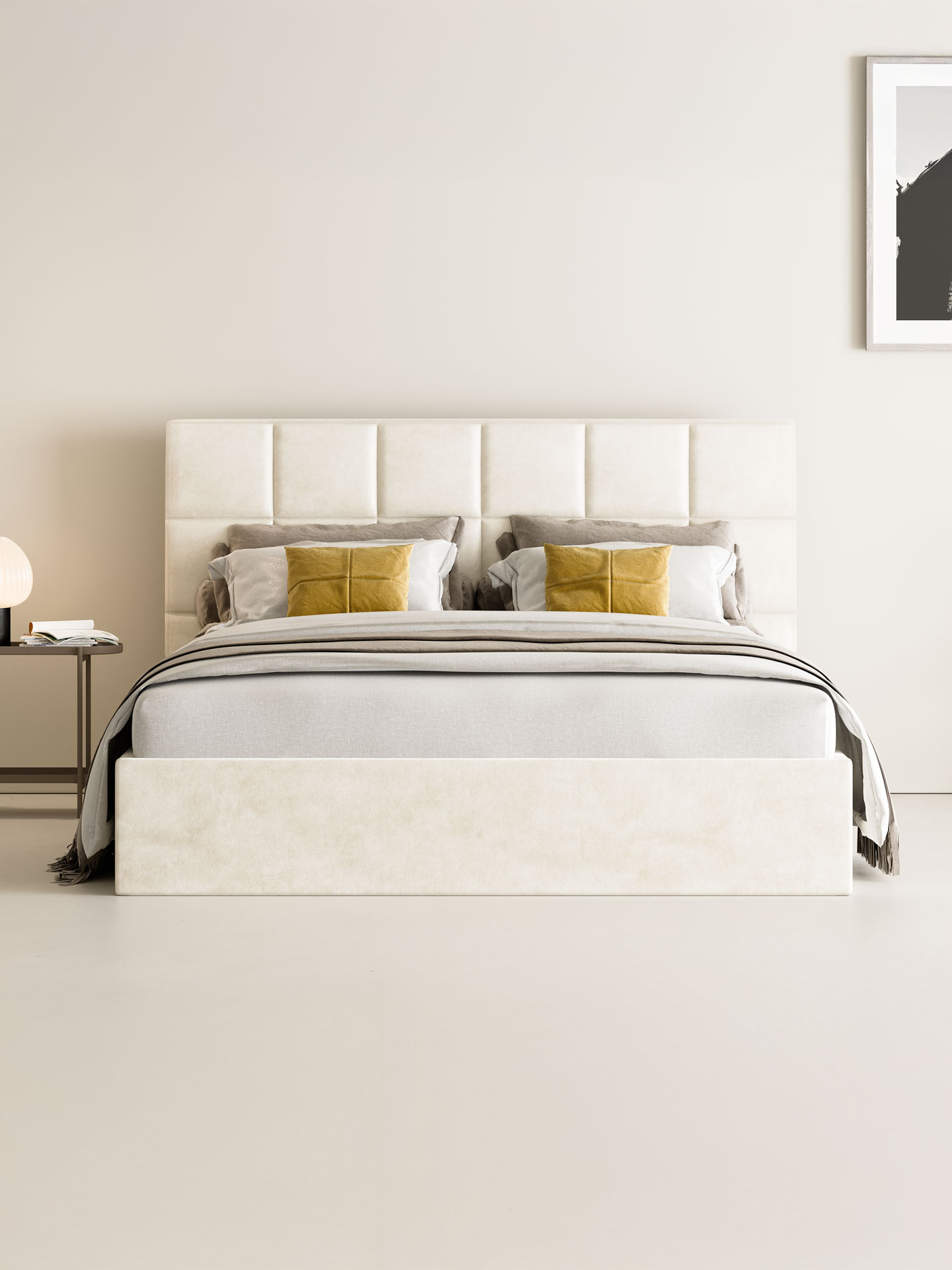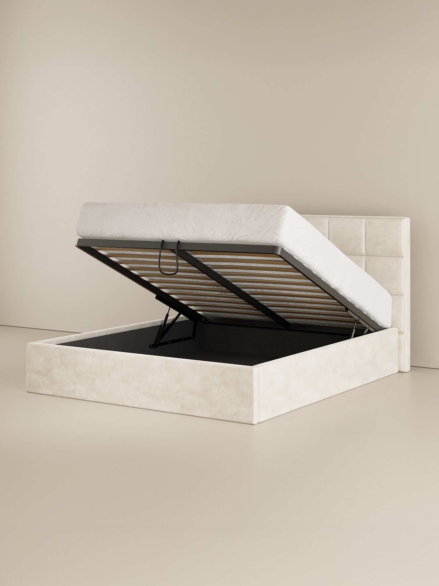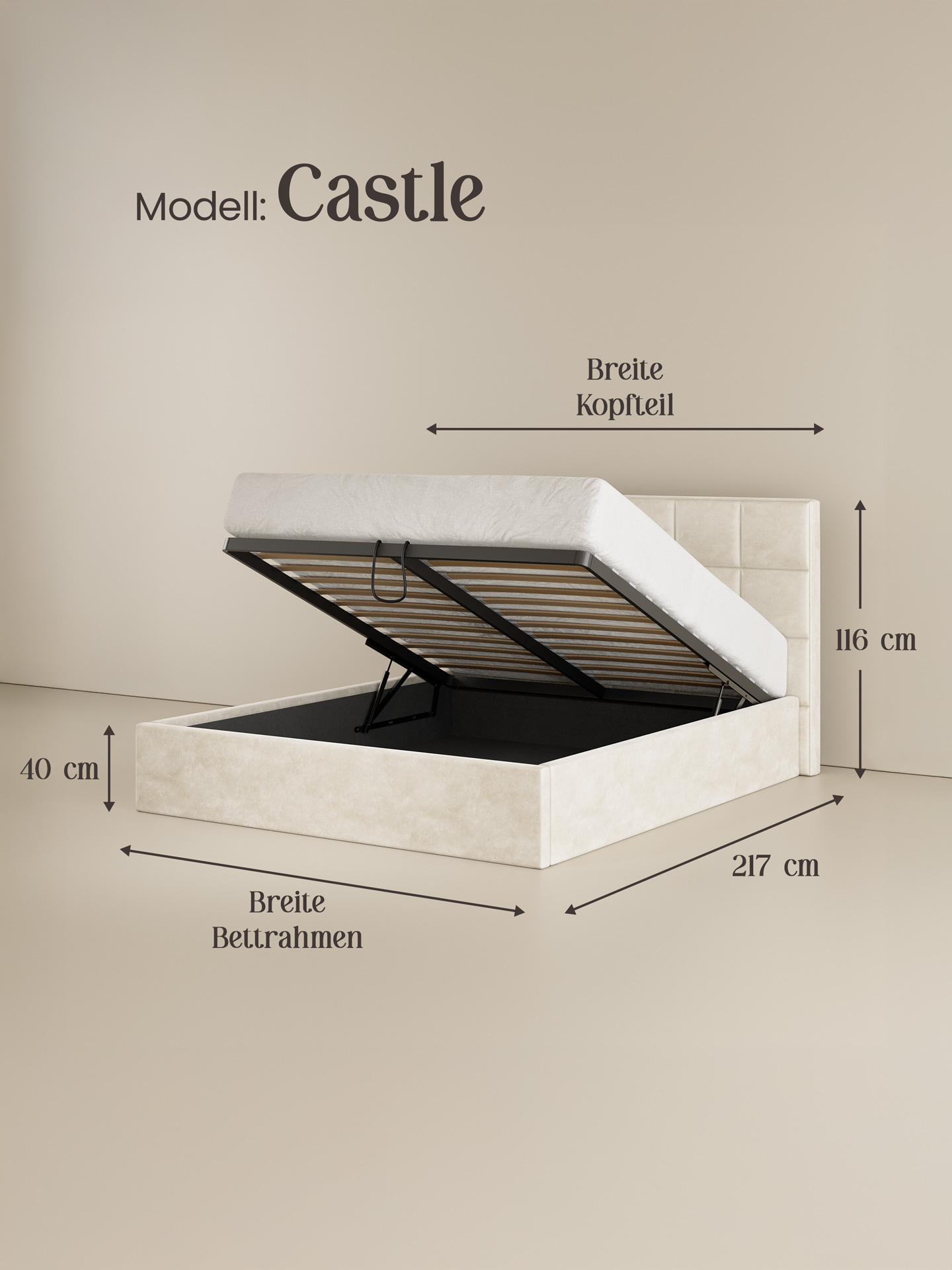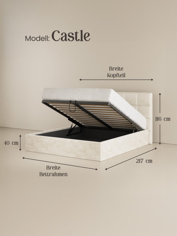 Das Polsterbett CASTLE setzt auf klare Linien und modernes Design. Der Samt-Velours-Bezug betont die elegante Formsprache, während das breit gesteppte Kopfteil im quadratischem Design, Struktur und Tiefe verleiht. Für stabilen Liegekomfort sorgt der integrierte Lattenrost mit Metallrahmen. Der geräumige Bettkasten bietet viel Platz für Decken, Kissen oder weitere Wohnaccessoires.